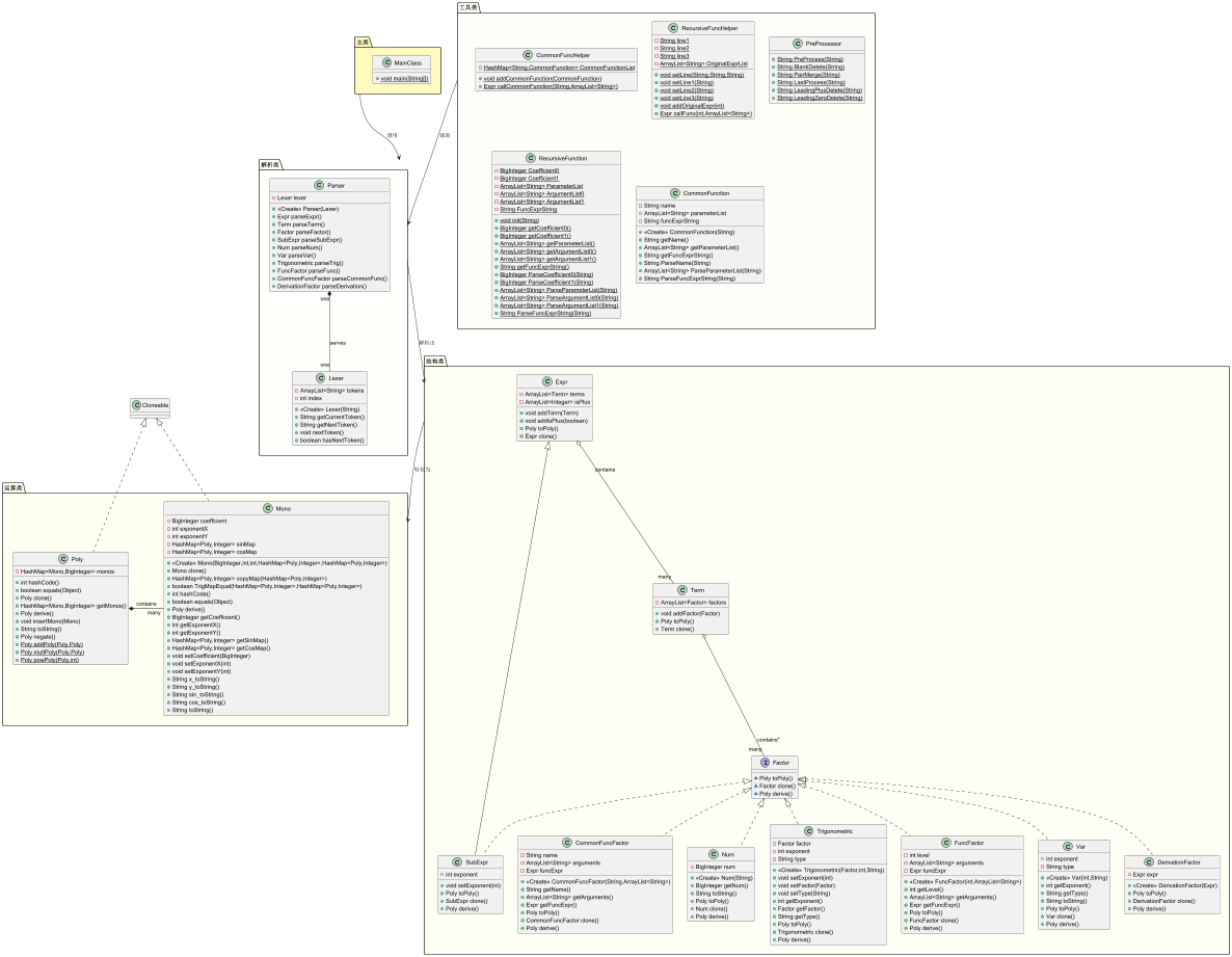 结构类由解析类通过递归下降法解析出,由 Expr、Term、Factor 组成层次结构。其中 Factor 作为最底层结构具有统一的行为,通过 toPoly()方法转化为运算类,运算还需要其实现深克隆方法和求导方法,因此将 Factor 设计为接口,由各种具体因子类实现。具体因子类的设计中将其内容设计为属性储存。